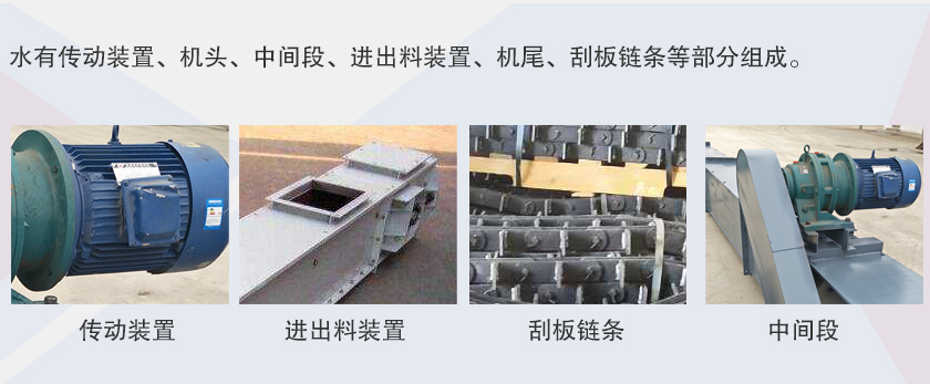 水平刮板輸送機(jī)有傳動(dòng)裝置、機(jī)頭、中間段、進(jìn)出料裝置、機(jī)尾、刮板鏈條等部分組成。
