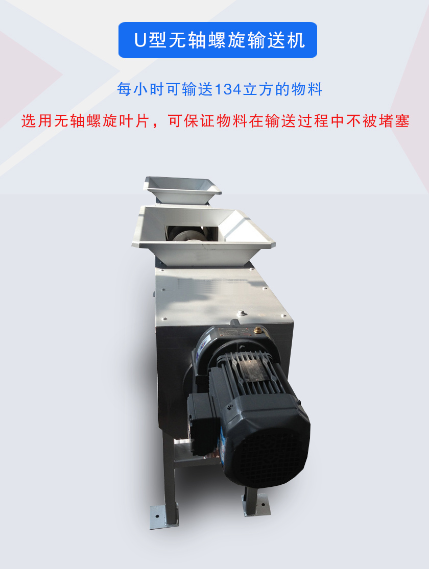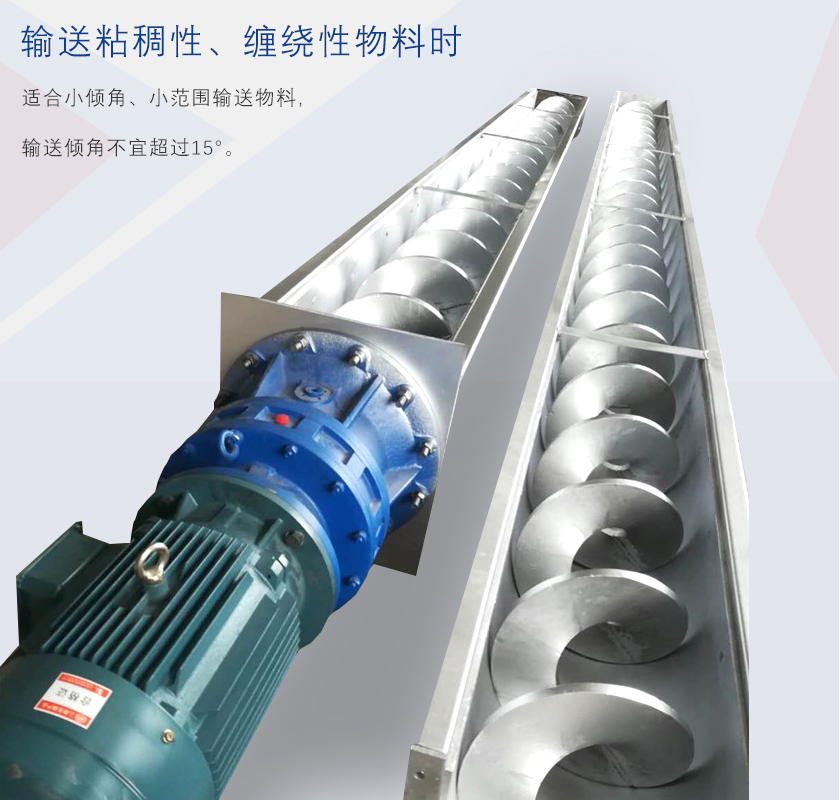 1、選用無(wú)軸螺旋葉片,可保證物料在輸送過程中不被堵塞。