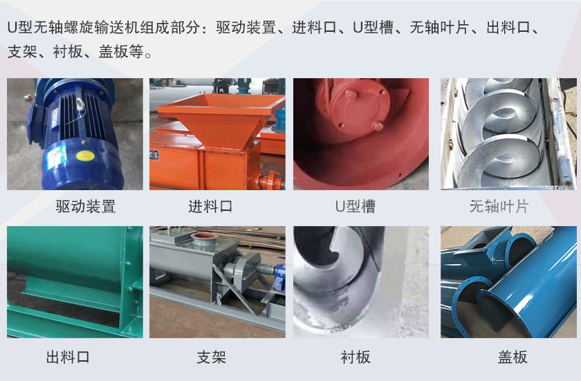 U型無(wú)軸螺旋輸送機(jī)組成部分:驅(qū)動(dòng)裝置、進(jìn)料口、U型槽、無(wú)軸葉片、出料口、支架、襯板、蓋板等。